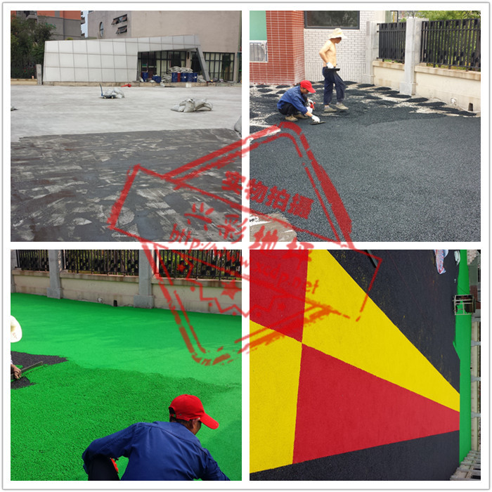 6) 一定要严格按照比例进行配料。视颗粒情况而定,好的用胶水少,差的用胶水多;大的用量少,小的用量多。底层橡胶颗粒:胶水=6-8:1;面层EPDM颗粒:胶水=5-6:1,催化剂一般不需要加,如环境温度低于10℃时,可适当加入5-10‰。